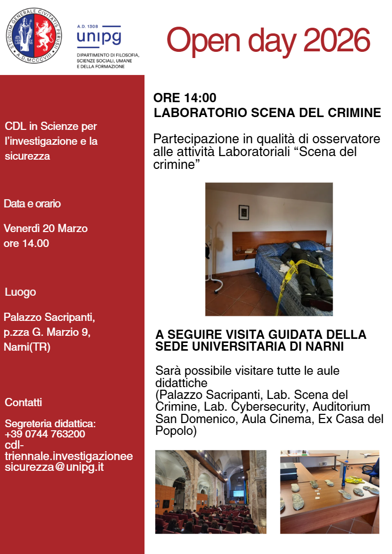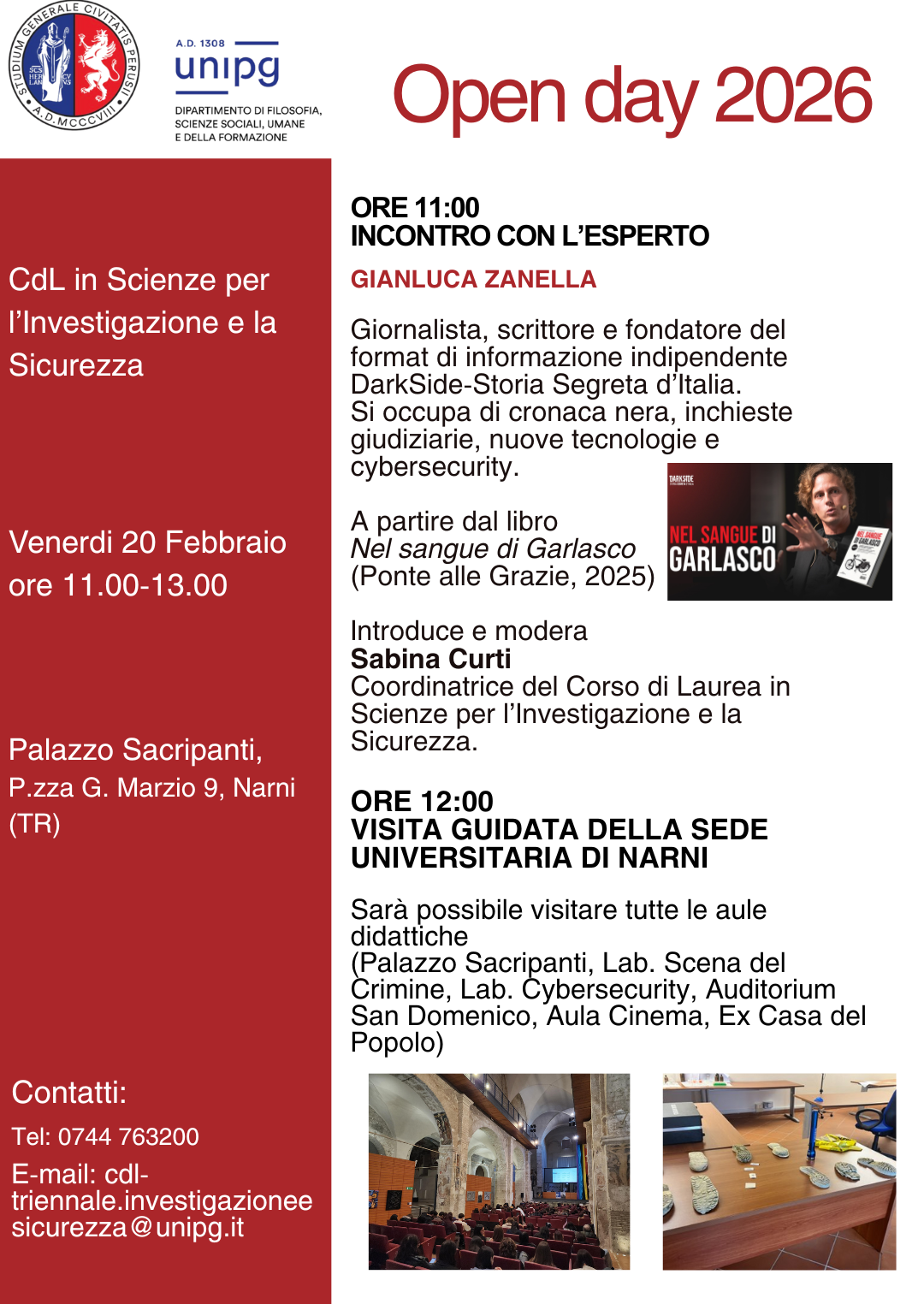 20 febbraio, 20 marzo, 28 aprile, 18 settembre 2026 - NARNI (TR) - Incontri di orientamento per conoscere il Corso di Laurea in Scienze per l'Investigazione e la Sicurezza - Programma 20 febbraio - Programma 20 marzo